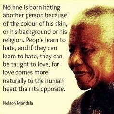 » Nadie nace odiando a otra persona por el color de su piel, sus antecedentes o su religión. La gente aprende a odiar, y si puede aprender a odiar, puede ser enseñada a amar. Por que el amor es más natural para el corazón humano que su opuesto»